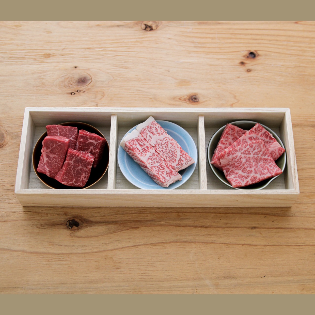 おおいた和牛の人気のサーロイン・希少部位2種類を、有田焼がより一層美しさを引き立て、目で楽しみ、そして味を楽しむ事ができます。
