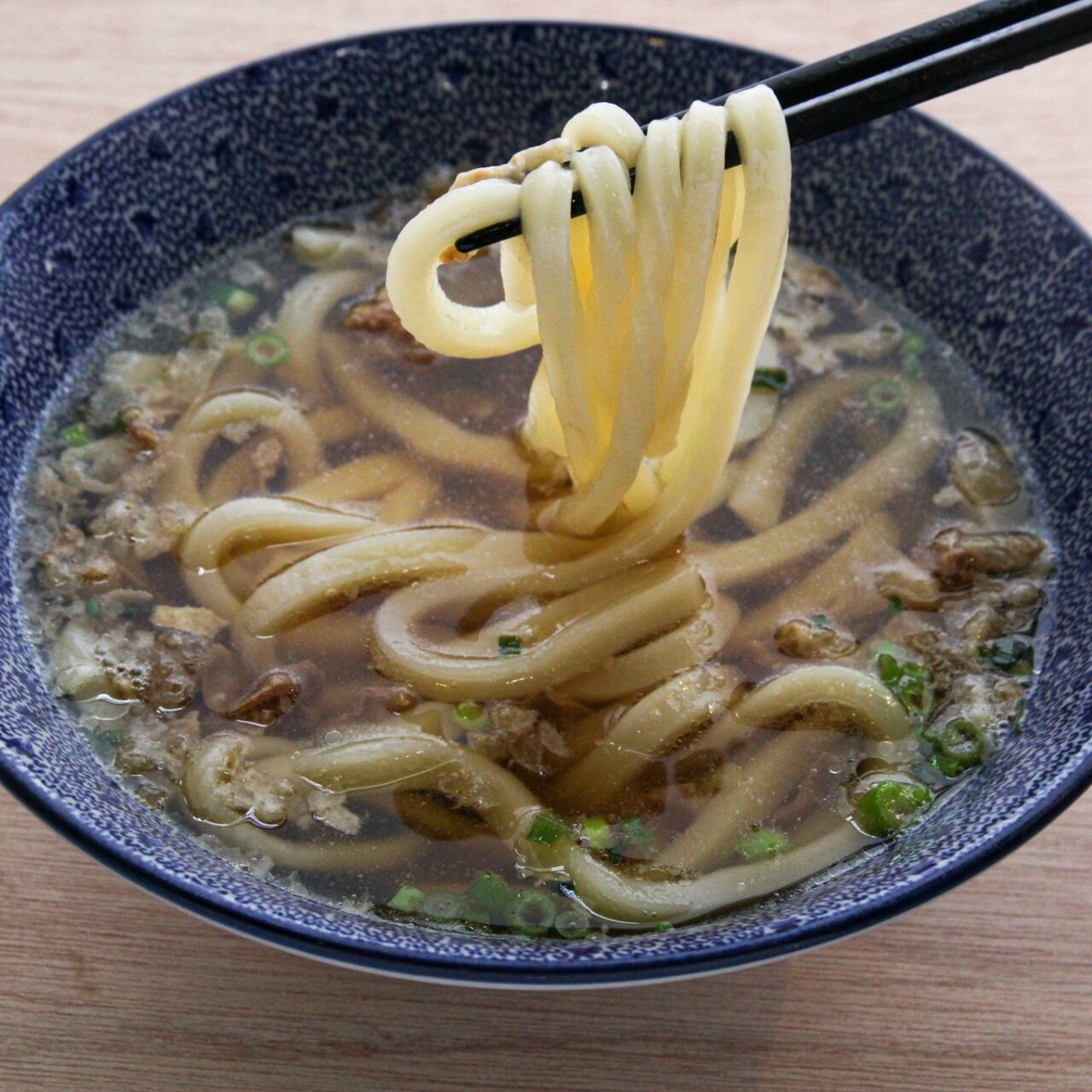 【原材料】あぶらかす:牛小腸 だし:しょうゆ、食塩、砂糖、鰹節エキス、動物性たんぱく加水分解物、チキンエキス、昆布エキス、あごエキス、ホタテエキス/調味料(アミノ酸等)、アルコール、酸味料、(一部に小麦・大豆・鶏肉・豚肉を含む) 冷凍うどん:小麦粉、食塩/加工でんぷん